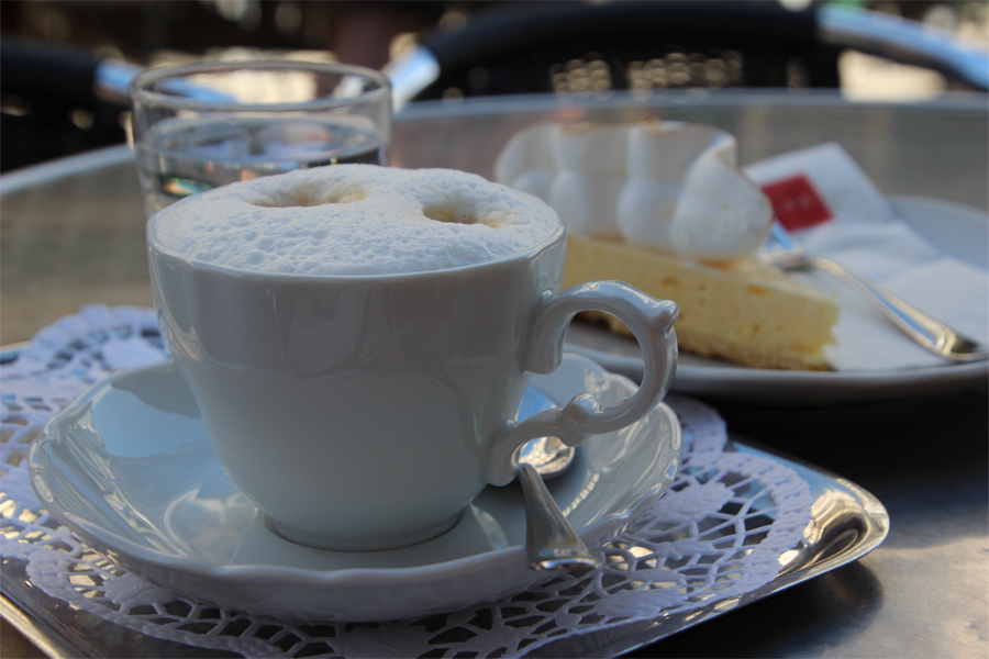 Re: Challenge 08/2014 • AufgetischtDas war mein Frühstück heute morgen: Melange mit Zitronentorte; am Naschmarkt in Wien.