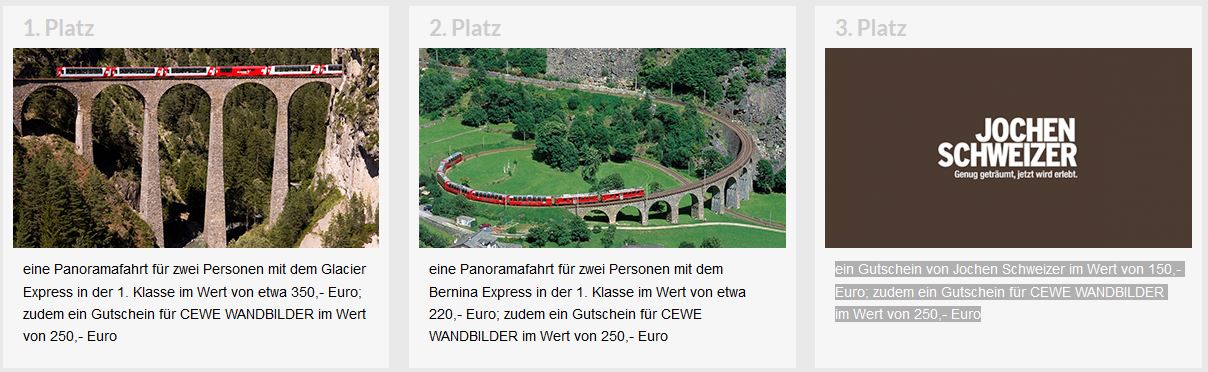 27.10.2015 - 31.03.2016 Ausflüge in die Gebiete der europäischen Hoch- und Mittelgebirge sind immer ein Erlebnis: Von der artenreichen Flora und Fauna des Harzes, über die mystische Atmosphäre des Schwarzwalds bis zum majestätischen Anblick der Alpen – beeindrucken Sie uns mit Aufnahmen faszinierender Berglandschaften! Als Hauptgewinn lockt eine Panoramafahrt für zwei Personen mit dem Glacier Express in der 1. Klasse im Wert von etwa 350,- Euro; zudem ein Gutschein für CEWE WANDBILDER im Wert von 250,- Euro. Der zweite Preis ist eine Panoramafahrt für zwei Personen mit dem Bernina Express in der 1. Klasse im Wert von etwa 220,- Euro; zudem ein Gutschein für CEWE WANDBILDER im Wert von 250,- Euro. Als dritten Preis vergeben wir einen Gutschein von Jochen Schweizer im Wert von 150,- Euro; zudem ein Gutschein für CEWE WANDBILDER im Wert von 250,- Euro Wir wünschen viel Erfolg! Sylke Re: Wettbewerb: BerglandschaftenIch habe mich mal für diesen Wettbewerb registriert, mal sehen, ob ich während der Laufzeit des Wettbewerbs auch zu thematisch passenden Fotos komme