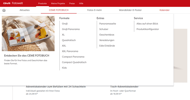 Die Papierauswahl sowie die Panoramaseite auf den Übersichtsseiten werden euch für eine bessere Darstellung und zur Erkennung der Papierqualitäten nun per Mouseover als Bewegtbild dargestellt. Der Foto-Adventskalender mit Türchenbildern und als Poster-Collage wird in der Übersicht ebenfalls als Video dargestellt. Außerdem findet ihr die Erinnerungstasche im Digitaldruck unter "Extra" ebenfalls mit einem kleinen Video zur Erläuterung.