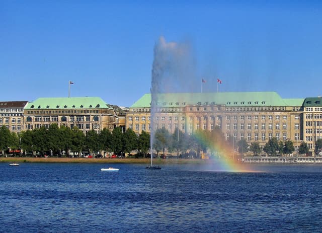 Da ein Erfolg aber so oder so recht unsicher ist, schicke ich mal dieses Bild der Hamburger Binnenalster, in der die Fontäne ihren eigenen Regenbogen produziert .