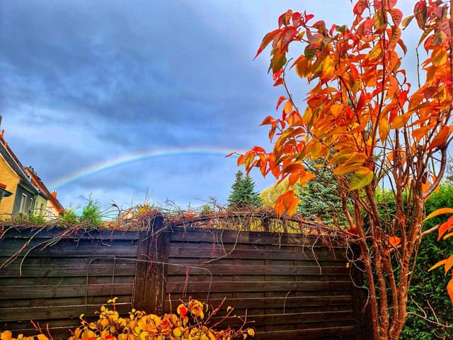 Hallo, mehr Zufall kann es nicht geben. Ich lese gerade von der Challenge in meinem Wintergarten als mir der Blick nach draußen diesen Regenbogen zeigt. Und das auch noch vor dem baum, der trotz starkem Wind noch einige bunte Blätter hat. Aufgenommen ist das Foto mit dem Samsung Handy S22 ISO 50, 23 mm, F1,8, 1/1000 s. Musste es aber in der Auflösung heruntersetzen, da es Original 5,55 MB sind, aber hier nur Bilder bis max. 4 MB übertragen werden,