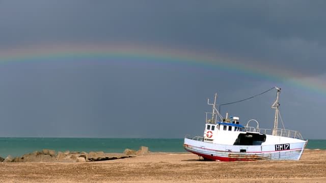 Regenbogen über Fischerboot in Nordjütland (Thorup Strand)