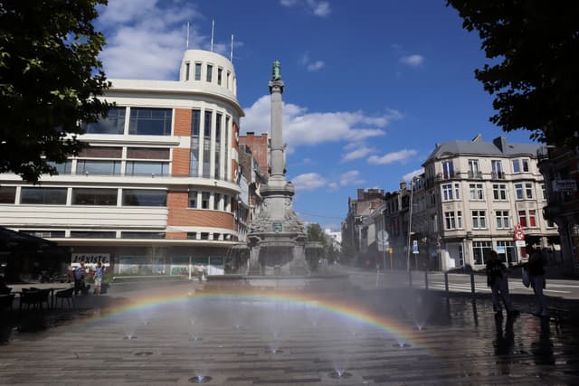 Da muss ich also auch ins Regenbogenarchiv greifen. Zwei Fotos habe ich ausgewählt. Das neuere stammt vom heurigen Urlaub - die Fußgängerzone von Verviers - mit einem Regenbogen ohne vorherigen Regen. Das andere ist schon ein paar Jahre alt und zeigt den abendlichen Blick vom Balkon.