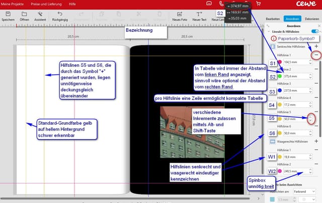 Das Minussymbol zum Löschen von Hilfslinien könnte durch das verständlichere Papierkorbsymbol ersetzt werden.