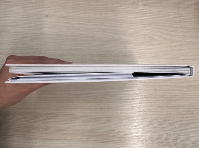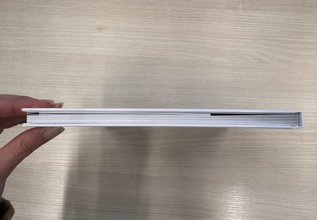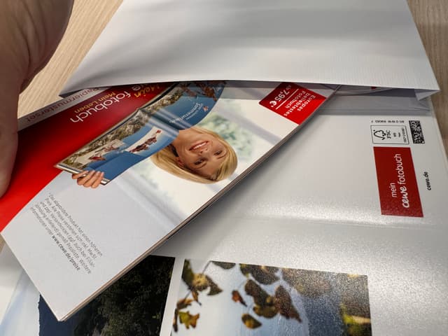 Ich habe ein kleines quadratisches CEWE FOTOBUCH (21x21 cm) hier und habe dir davon mal Bilder gemacht.
