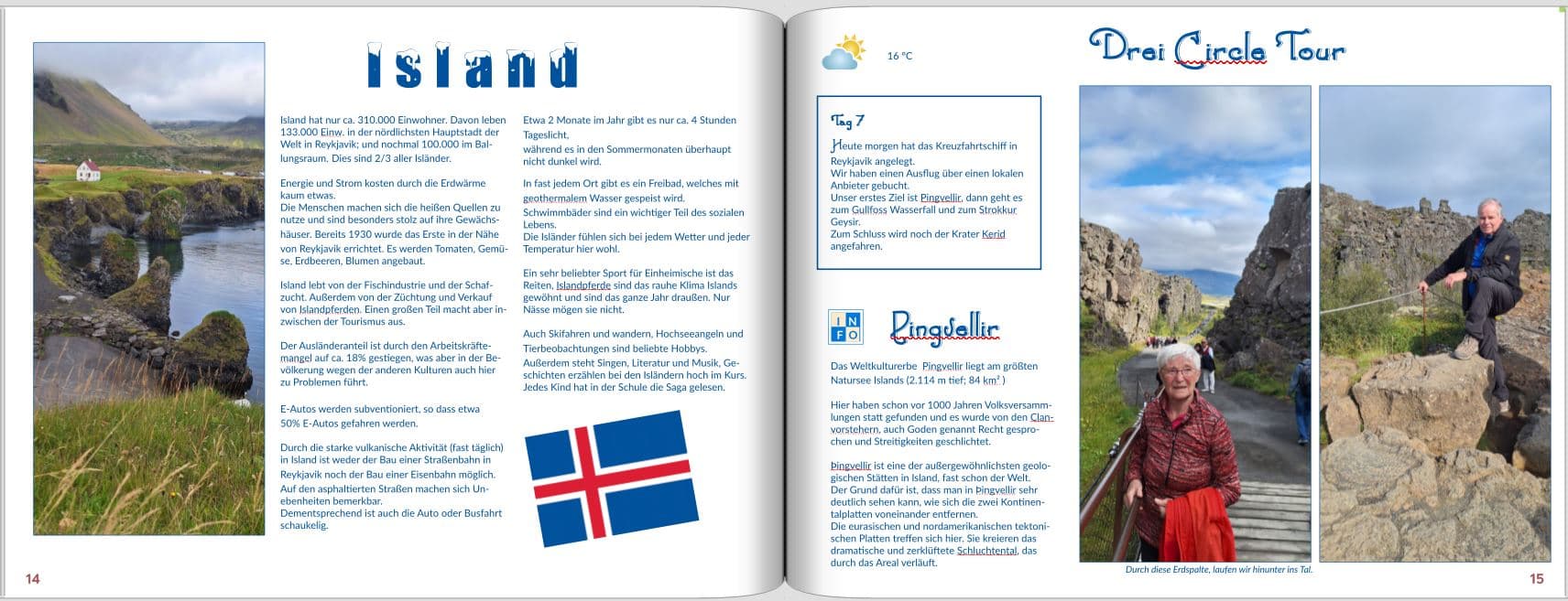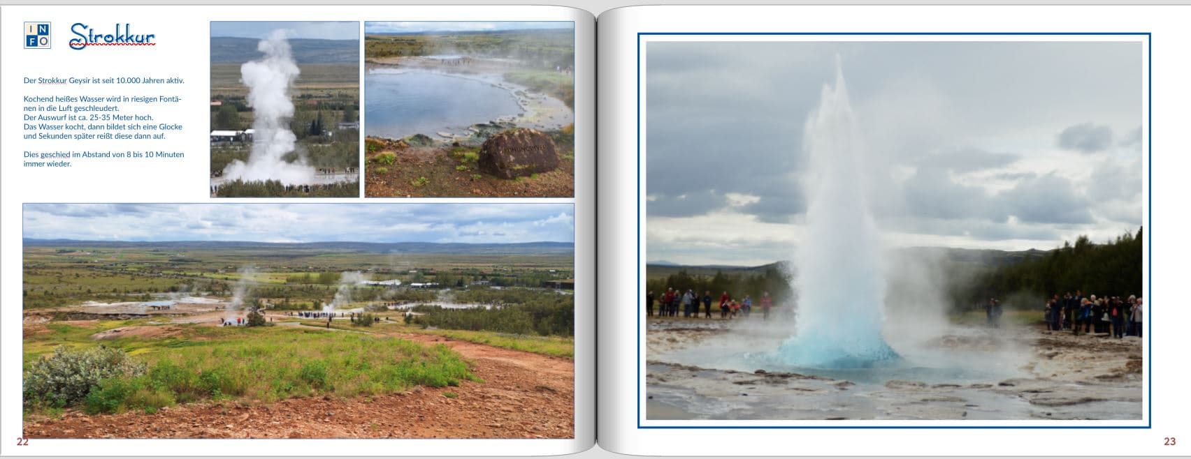 Monika hatte mir empfohlen, für Island (Iceland) ein Blau (aus der isländischen Flagge) und für Grönland (Greenland) ein Grün zu verwenden. Für Island passt das Blau tatsächlich sehr gut – bei den Fotos, dem Text und auch beim Info-Zeichen.