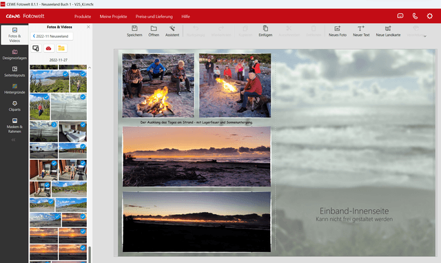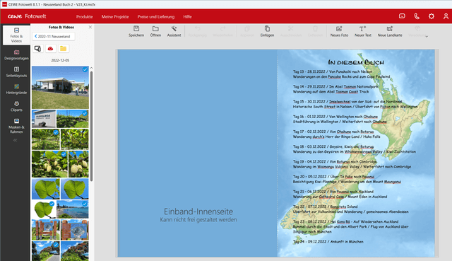 ich habe nach der Neuseeland-Reise zwei Fotobücher erstellt, was zugegeben etwas gedauert hat. Umso mehr habe ich mich gefreut, dass seit Version 8.1 die Einband-Innenseiten endlich auch farblich anpassbar sind - das Weiß war mir eigentlich schon immer zu hart.
