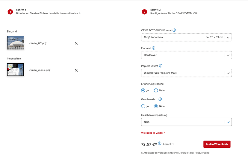 Ich habe nach der InDesign-Vorlage von cewe ein Fotobuch erstellt und zwei PDF-Dateien hochgeladen (Umschlag und Inhaltsseiten). Meine voreingestellte Produktauswahl ist im 2. Schritt (nach dem Upload) aber nicht zu sehen und ich habe an diesem Punkt der Bestellung keine Möglichkeit, z.B. das Inhaltspapier zu ändern. Zu sehen sind hier die Attribute meiner letzten Fotobuchbestellung.