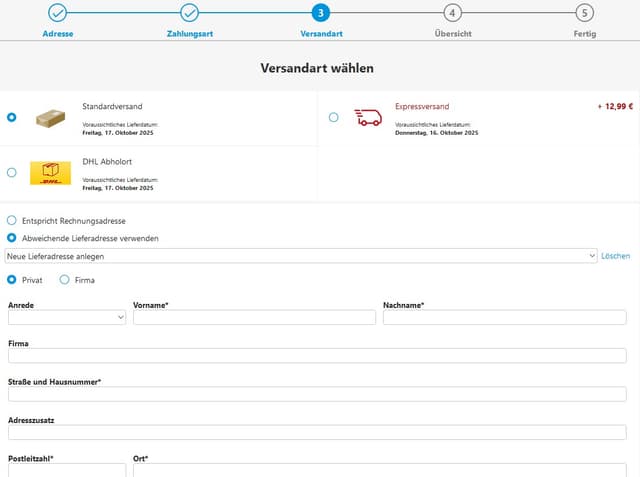 die Angabe einer von der Rechnungsadresse abweichenden Lieferadresse ist nur möglich bei Zahlung per Vorkasse (z.B. per Kreditk., PayPal usw.).