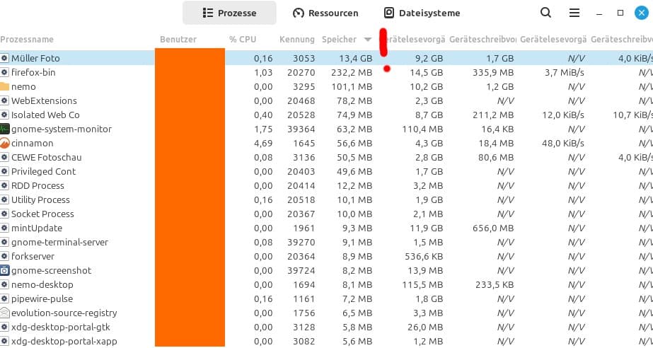 eine Frage an den technischen Support bzw. an alle Linux-User: Auf Linux (Mint 22.2) gibt es öfters Memory Leaks in der Fotobuch-Software. Das System wird nach einer gewissen Nutzungszeit unbenutzbar langsam. Das passiert unregelmäßig, aber ganz plötzlich und unberechenbar. Auf den Screenshots sieht man, wie Cewe den kompletten RAM und die Swapfile belegt. Benutze Müller Foto 8.1.1