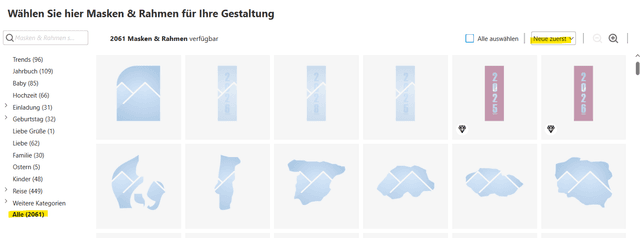 Und ebenfalls (schon eine Weile) neu: Die Sammlung aller Masken/Rahmen ganz unten mit der Auswahl "Alle". Ich nutze das gern mit der Änderung auf "Neue zuerst" (im Screenshot markiert) und habe so die neuesten Sachen ganz oben. Das funktioniert übrigens ganz genauso bei Cliparts und Hintergründen, sodass man in Abständen herrlich beim Stöbern alle tollen neuen Objekte schnell auf einen Blick entdecken kann. 👍