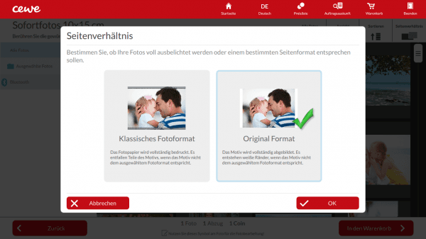 Inzwischen bieten die Fotostationen schon seit einigen Jahren die Möglichkeit, bei jedem Foto zu entscheiden, ob das Bild in das Druckformat eingepasst wird (Standardeinstellung)