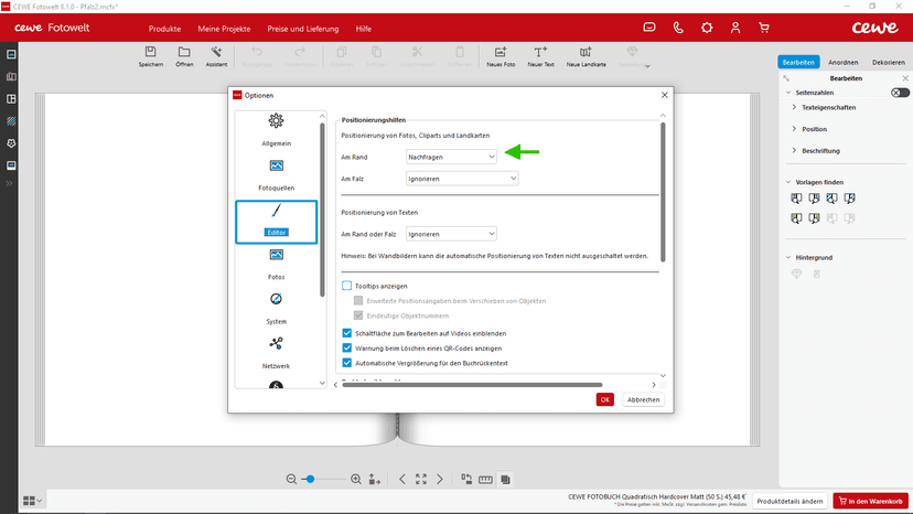 Mein aktuelles Fotobuch habe ich erstmals in der Version 8.1.0 begonnen. Nach jedem Programmstart ist die Einstellung Positionierung von Fotos etc. am Rand wieder verstellt. Ich möchte sie dauerhaft ignorieren, was in bisherigen Versionen ja kein Problem war.